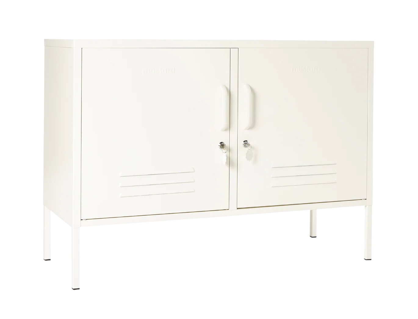 Inside, you'll find two adjustable shelves and a handy hook inside each door. On the outside, you'll find handles, locks, custom key rings, air vents, two cable holes, wall attachment points and a subtle embossed 'mustard on each door, to let you know it's the real deal. Plus, the whole locker is smooth, matte and magnetic! Screens don't always do our colours justice — order a swatch to see how it looks in your space. The Lowdown is perfectly proportioned to make the most of that little alcove in your living room, but she works just as well in the bedroom or hallway. Versatility is her middle name!