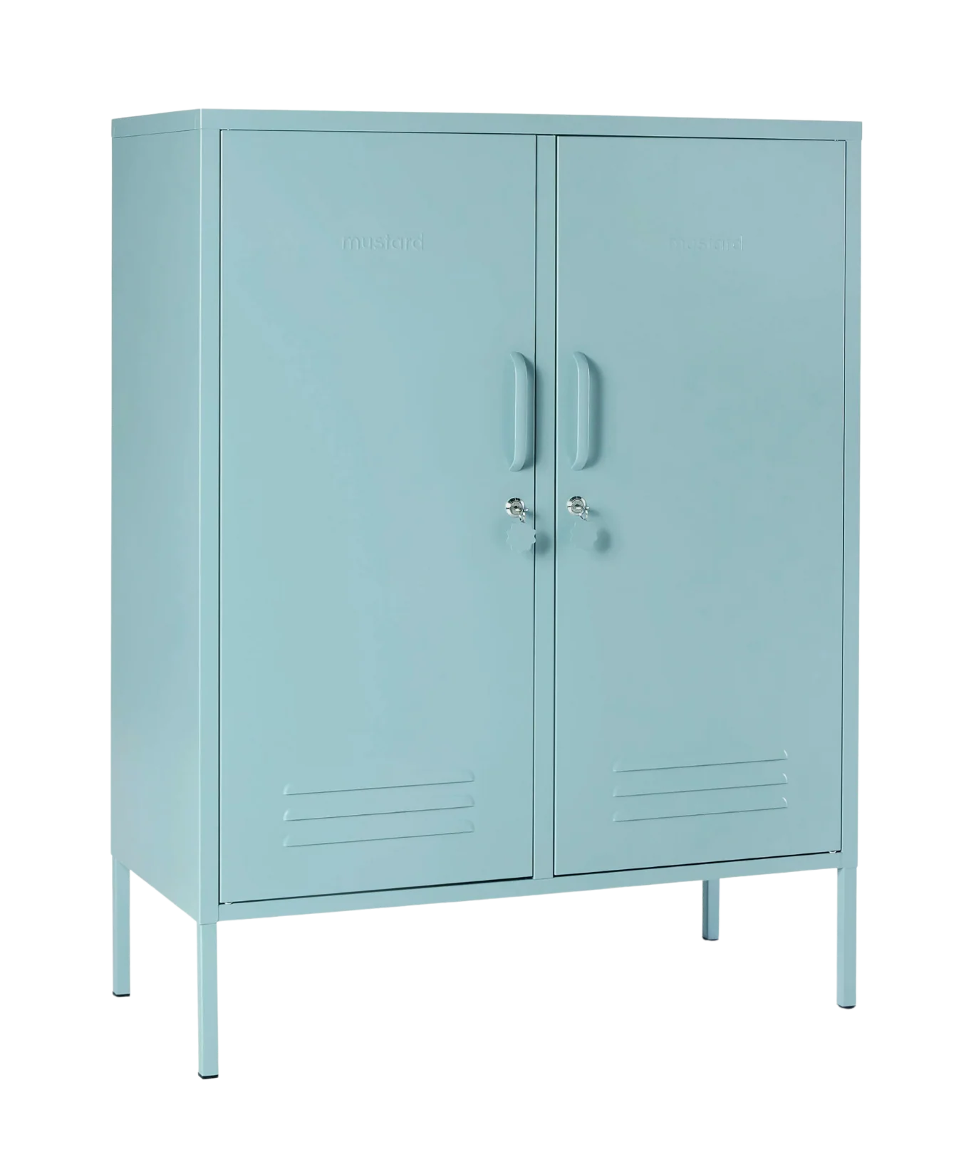Inside, you'll find two adjustable shelves and a handy hook inside each door. On the outside, you'll find handles, locks, custom key rings, air vents, two cable holes, wall attachment points and a subtle embossed 'mustard on each door, to let you know it's the real deal. Plus, the whole locker is smooth, matte and magnetic! Screens don't always do our colours justice — order a swatch to see how it looks in your space. Because she's perfectly in the middle! Use her as a toy cupboard, a dining buffet or a hallway drop-zone. Just the right amount of storage, every time.