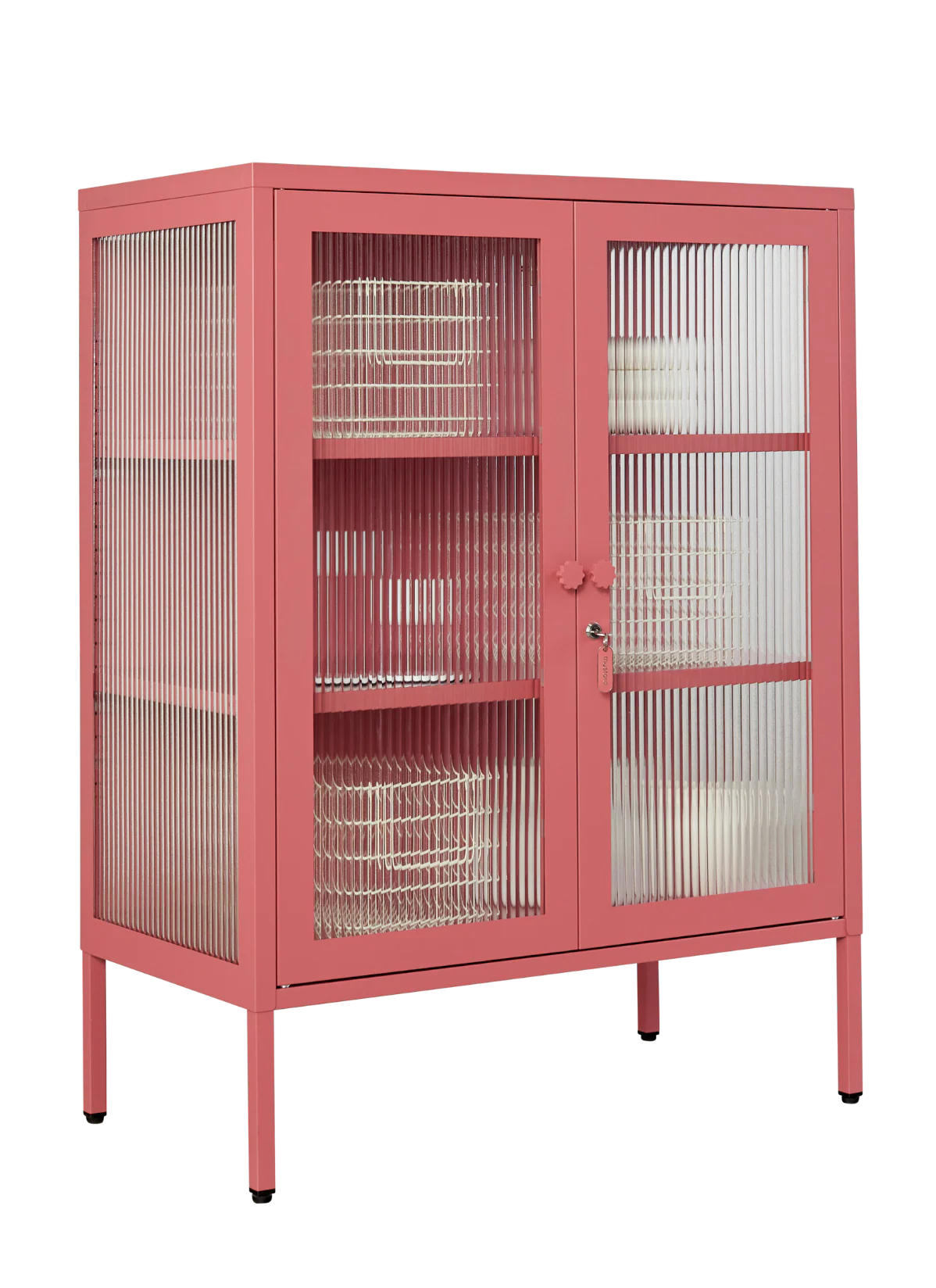 Inside you'll find two adjustable shelves, a door bolt and a subtle embossed 'mustard', to let you know it's the real deal. Outside, fluted glass panels are set in a metal frame with medallion handles, a lock, a custom Mustard enamel keyring, adjustable feet and wall attachment points. Screens don't always do our colours justice — order a swatch to see how it looks in your space. She's the ultimate drinks cabinet, kitchen buffet or sideboard, with fluted glass to blur the lines between concealing and revealing. A little secret? Everything looks better behind fluted glass!